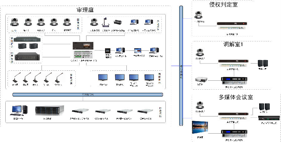 项目包含:1间知识产权审理庭,1间侵权判定室,1间调解室,1间多媒体会议室,使用4台南宫NG·28科技(AVSYS)多媒体综合管理一体机,实现统一控制管理,音视频调度,会议室互动等应用。