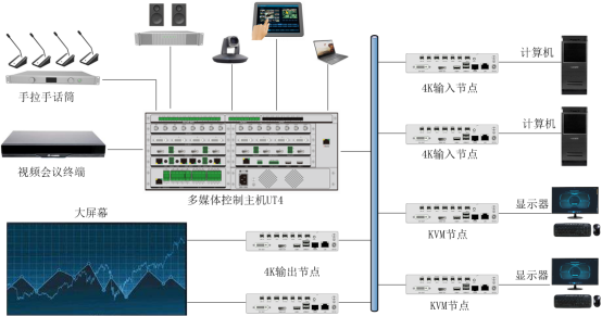 系统支持可视化操作平台IMC,在IMC平台上可看到任何一个分布式节点及UT主机输入的视频图像,操作员只需拖动相应视频,即可实现视频信号的切换。